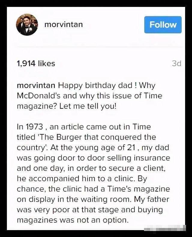 在等待时,一本他当时根本买不起的《时代周刊》吸引住了他的目光,里面有一篇文章讲的是麦当劳汉堡的故事。